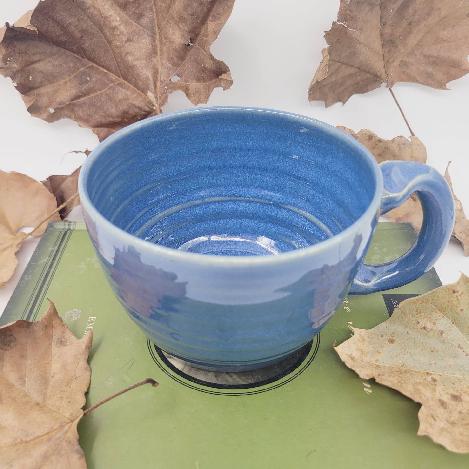 Fluffkins McPoufy is completely handmade from cone 10 stoneware, so he's very durable and is even safe to use in the microwave and dishwasher. He is finished with a food-safe glaze in Blue. He is an Ug-Chug Soup Mug, so he is stamped with the Ug-Chug logo and his year.