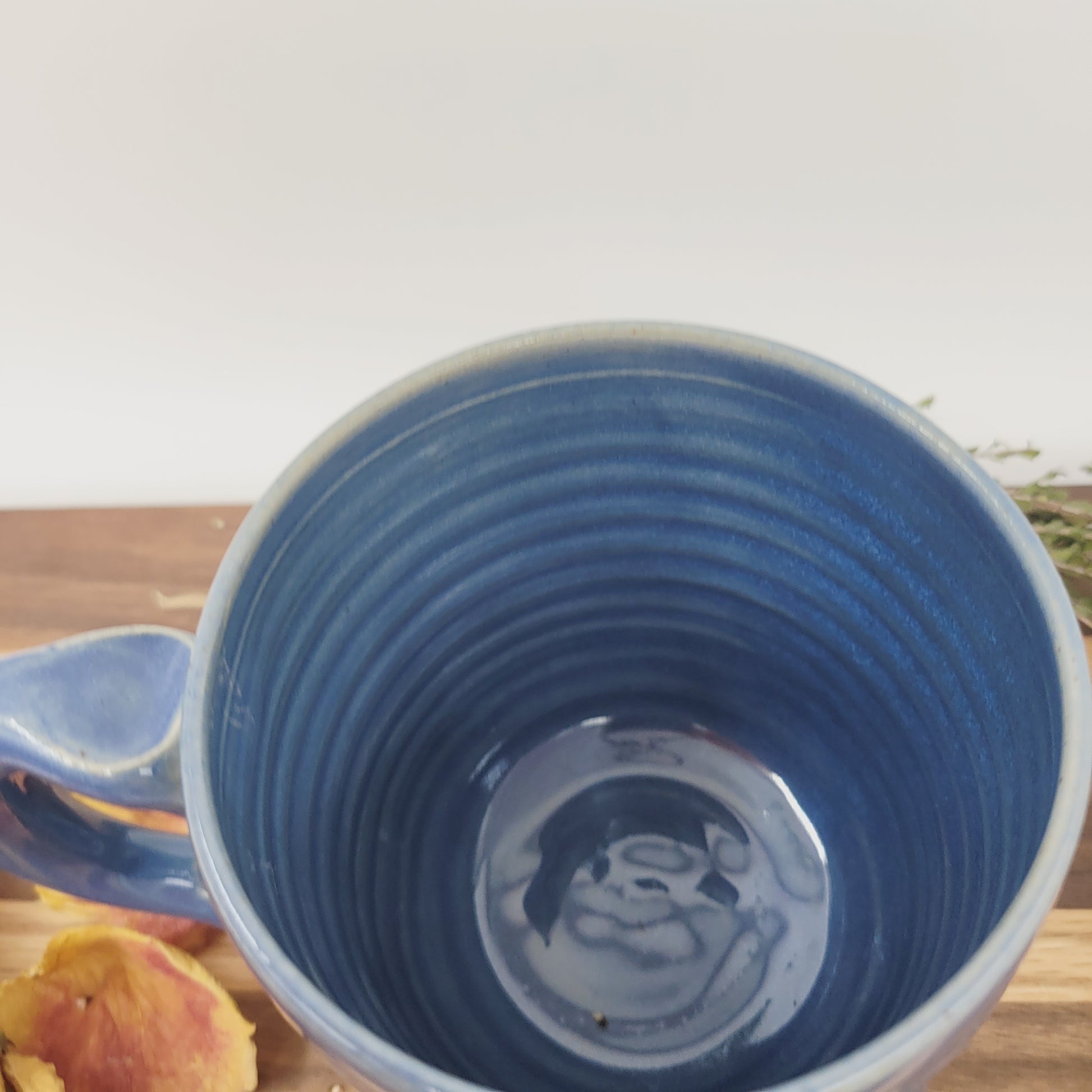 This mug is about 4" tall and 3.5" wide and holds about 16 ounces. It is finished in a food-safe blue glaze, with the heart in black and bare clay. It is stamped with the Ug-Chug logo and its year.