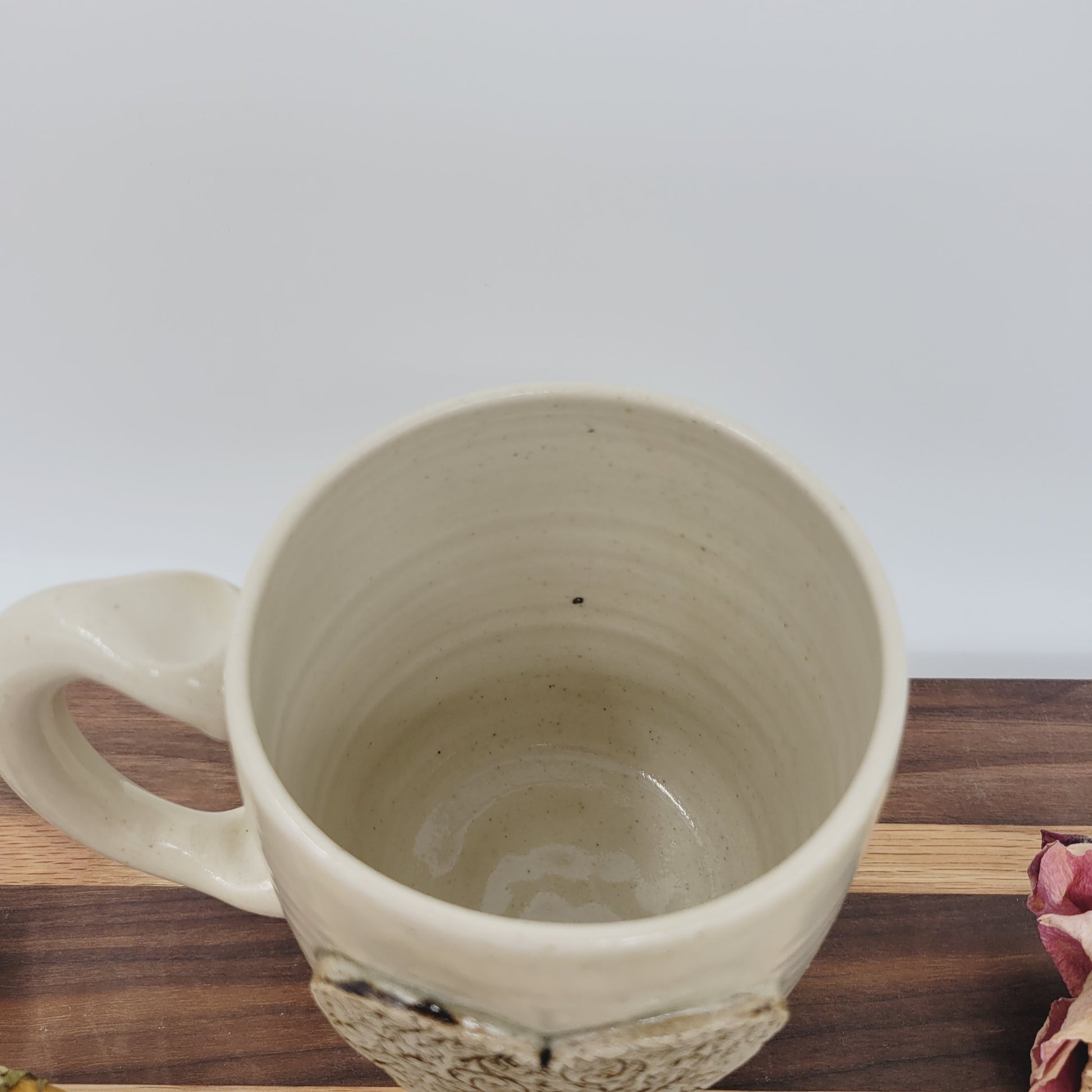This mug is about 4" tall and 3.25" wide and holds about 14 ounces. It is finished in a food-safe cream glaze, with the heart in black and bare clay. It is stamped with the Ug-Chug logo and its year.