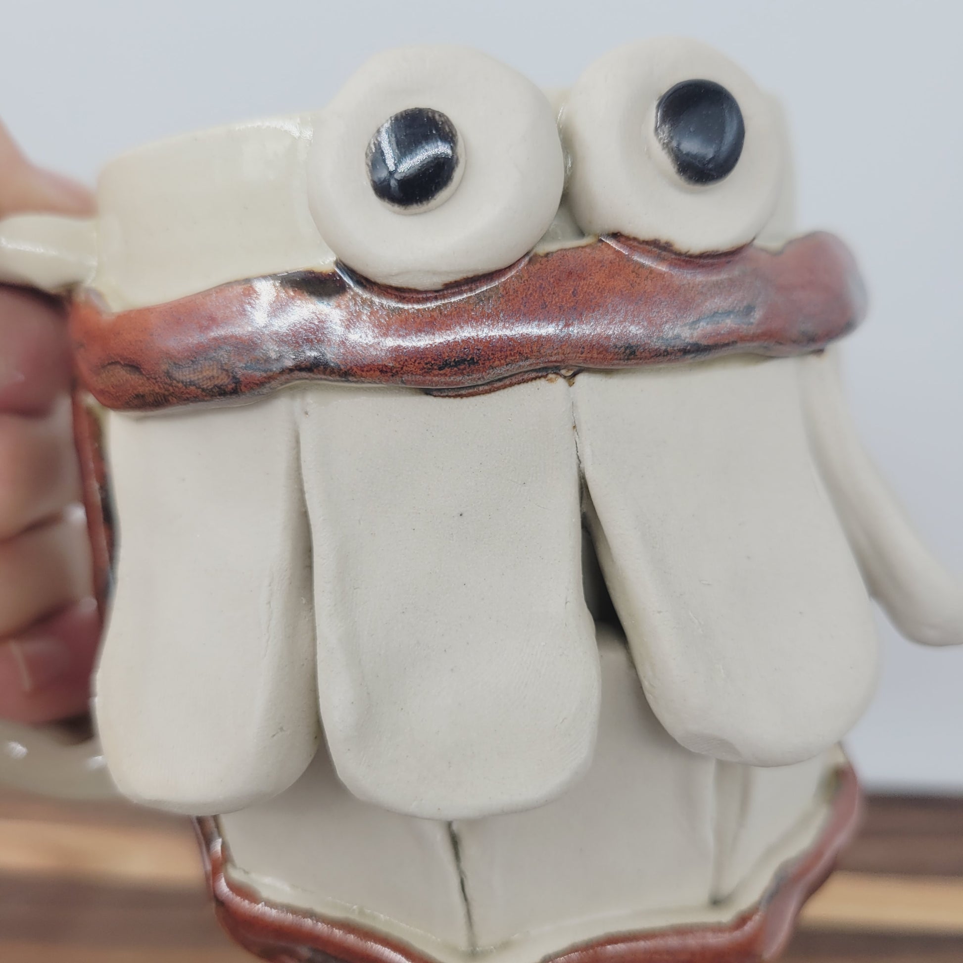 Don't worry, though, while Lewis deliberates on the purpose of his purchases, he remains awesome at beverage holding. He was first thrown on the pottery wheel and his eyes and features were made and added by hand. He's made from cone 10 stoneware, so he's very durable and is even safe to use in the microwave and dishwasher with care. Lewis is an Ug-Chug Mug, so he's stamped with the Ug-Chug logo and his year.