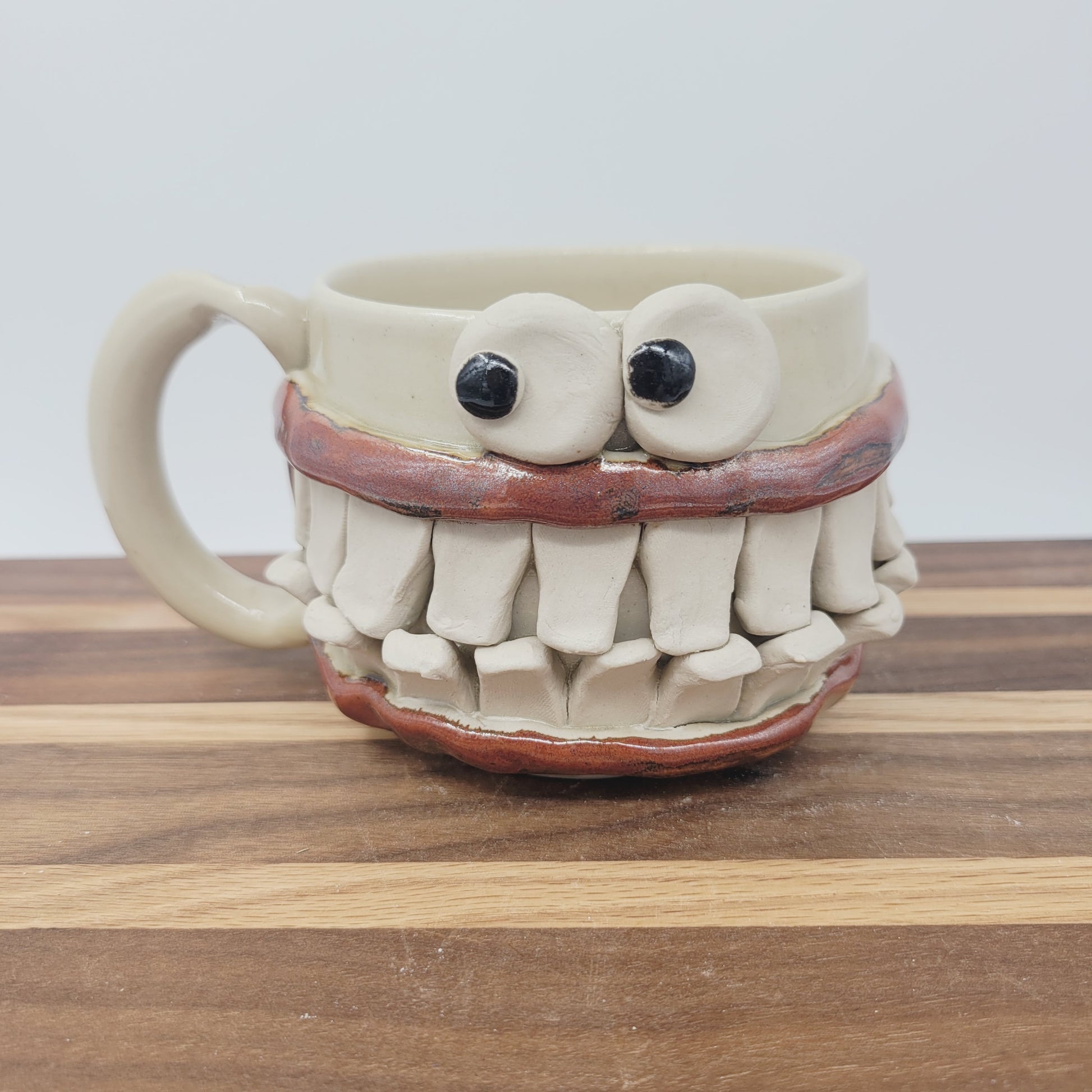 Maybe, though, it's because he loves holding beverages, and he knows he's great at it. He's made from cone 10 stoneware, so he's very durable. He was first thrown on the pottery wheel, and his features were made and added by hand. He is microwave and dishwasher safe. Ronald is an Ug-Chug Mug, so he's stamped with the Ug-Chug logo and his year.