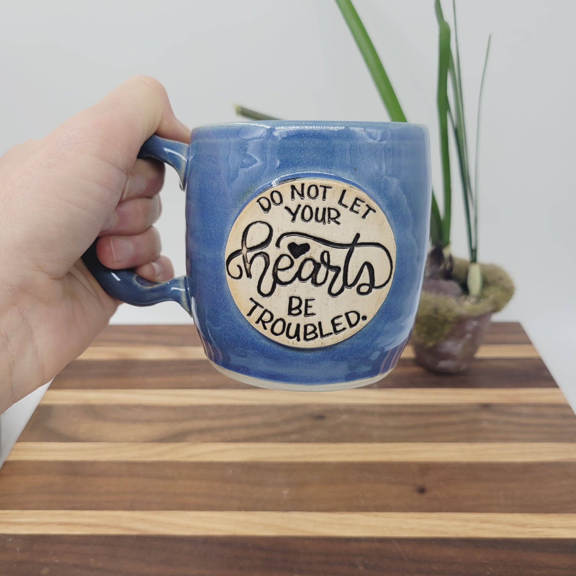 Do Not Let Your Hearts Be Troubled | Comforting Christian Coffee Cup | Bible Verse Mugs | Stoneware Pottery | Blue