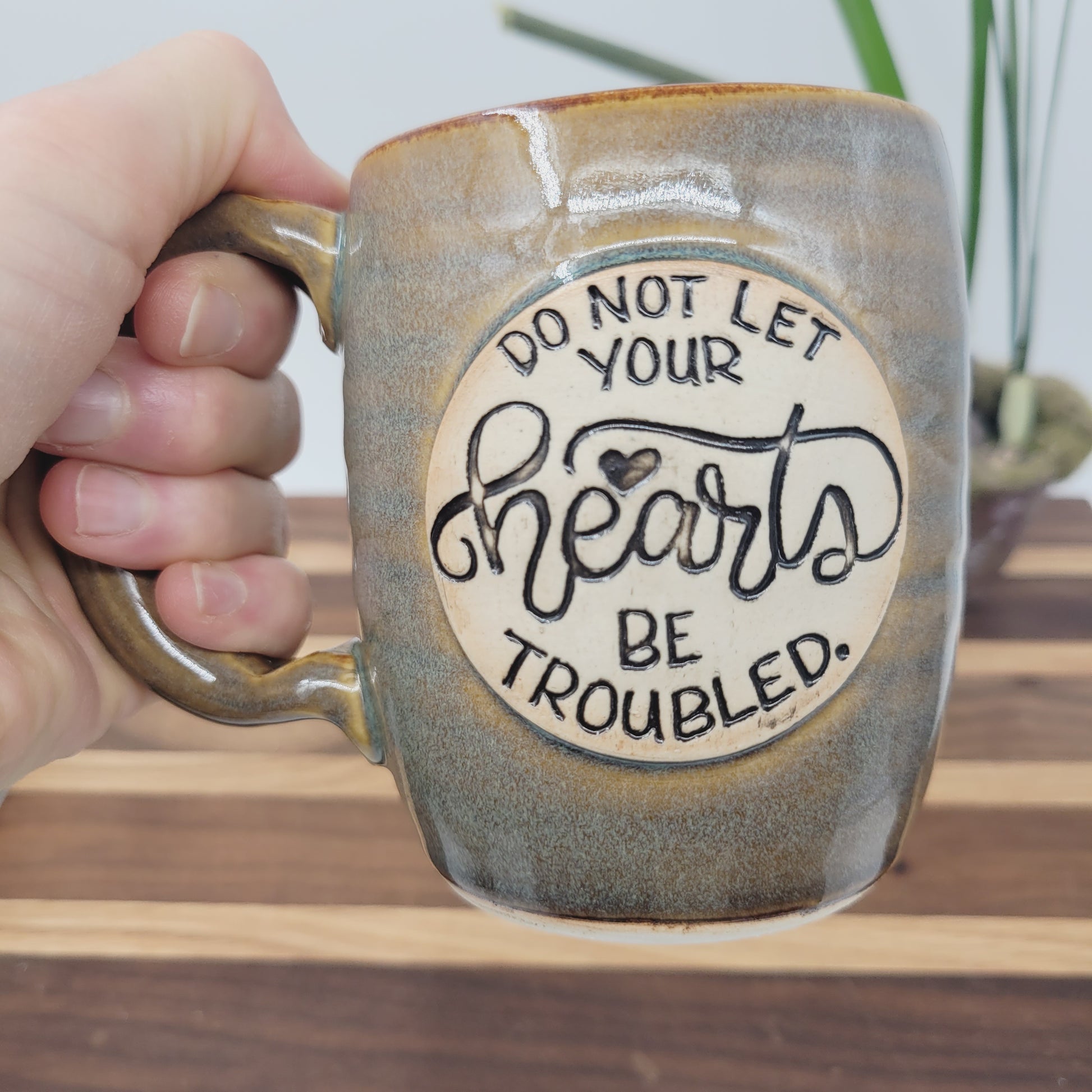 Do Not Let Your Hearts Be Troubled | Comforting Christian Coffee Cup | Bible Verse Mugs | Stoneware Pottery | Caramel Blue Brown