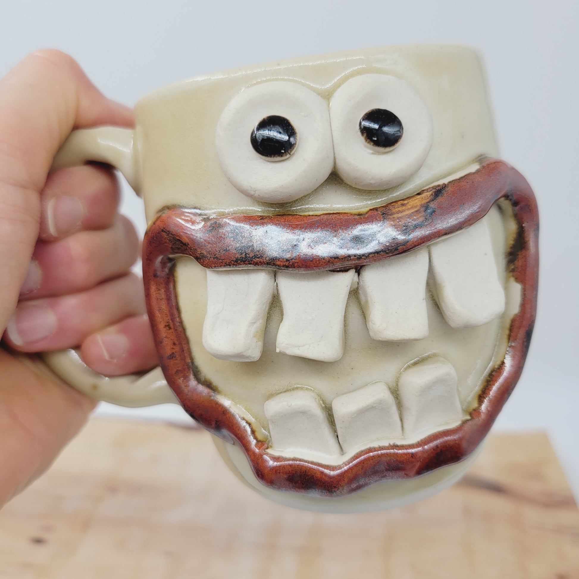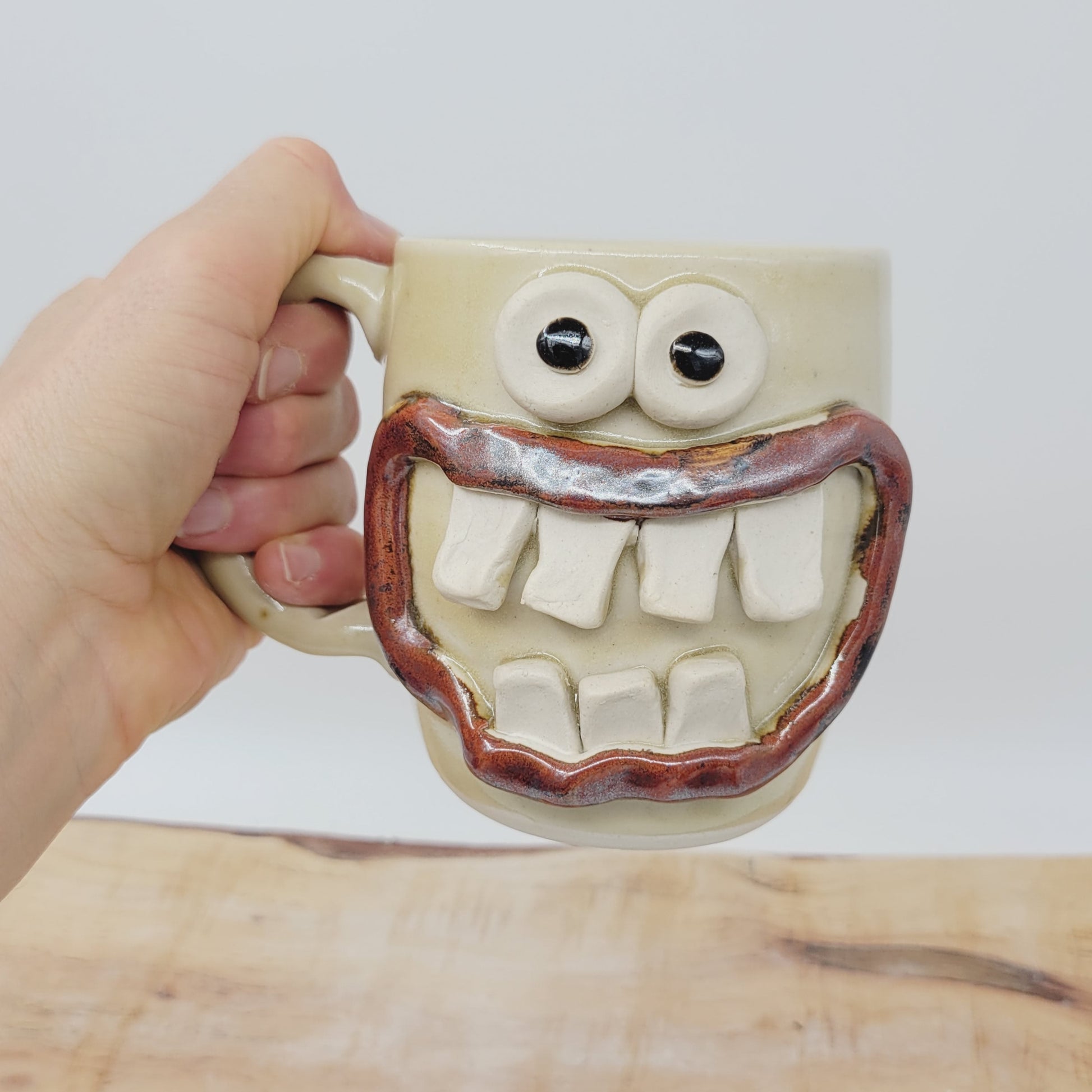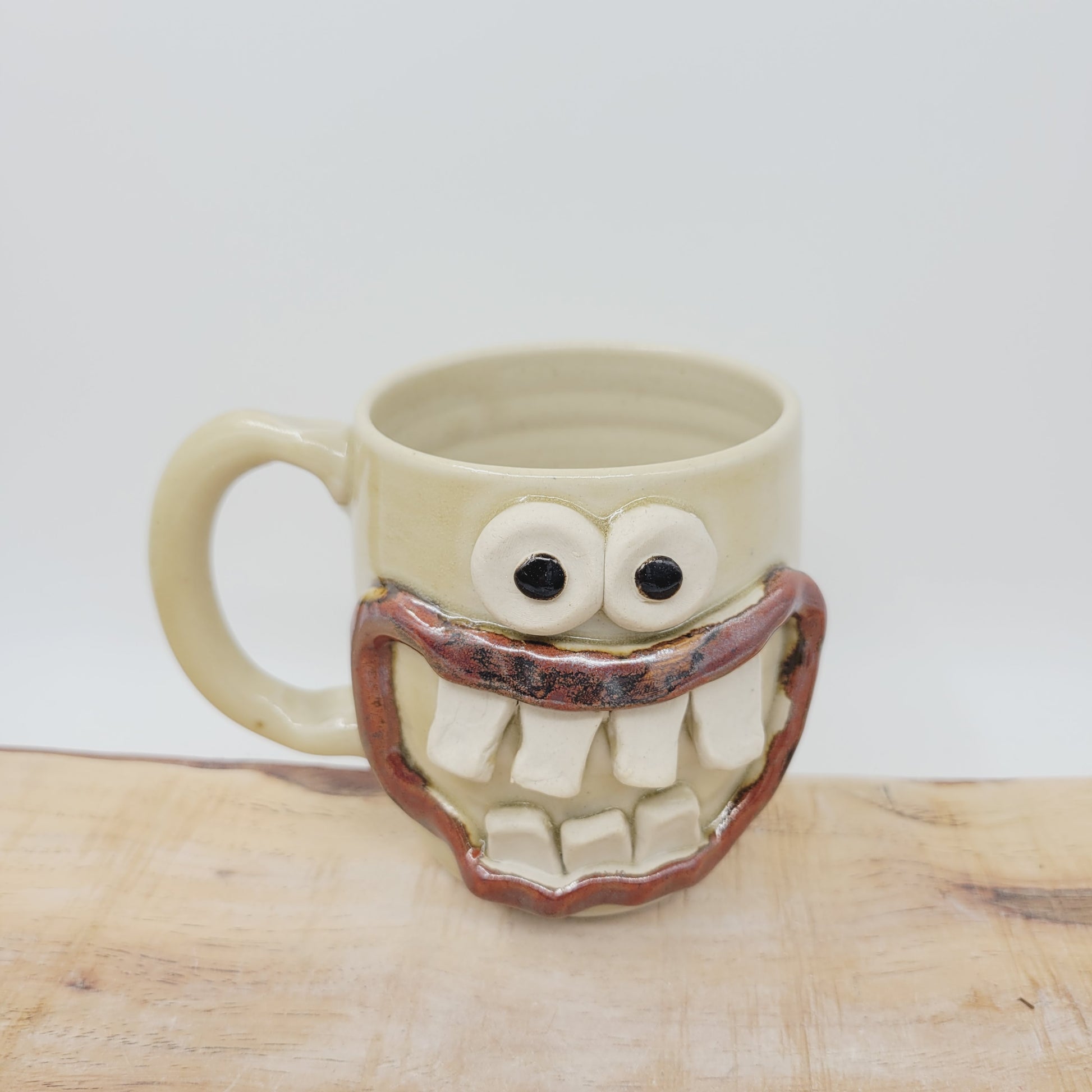 Roland is a one of a kind piece, completely handmade from cone 10 stoneware. He was first thrown on the pottery wheel, and then his eyes, mouth, and teeth were made and added by hand. He is very durable and is even safe to use in the MICROWAVE and DISHWASHER. He is an Ug-Chug Mug, so he's stamped with the Ug-Chug logo and his year.