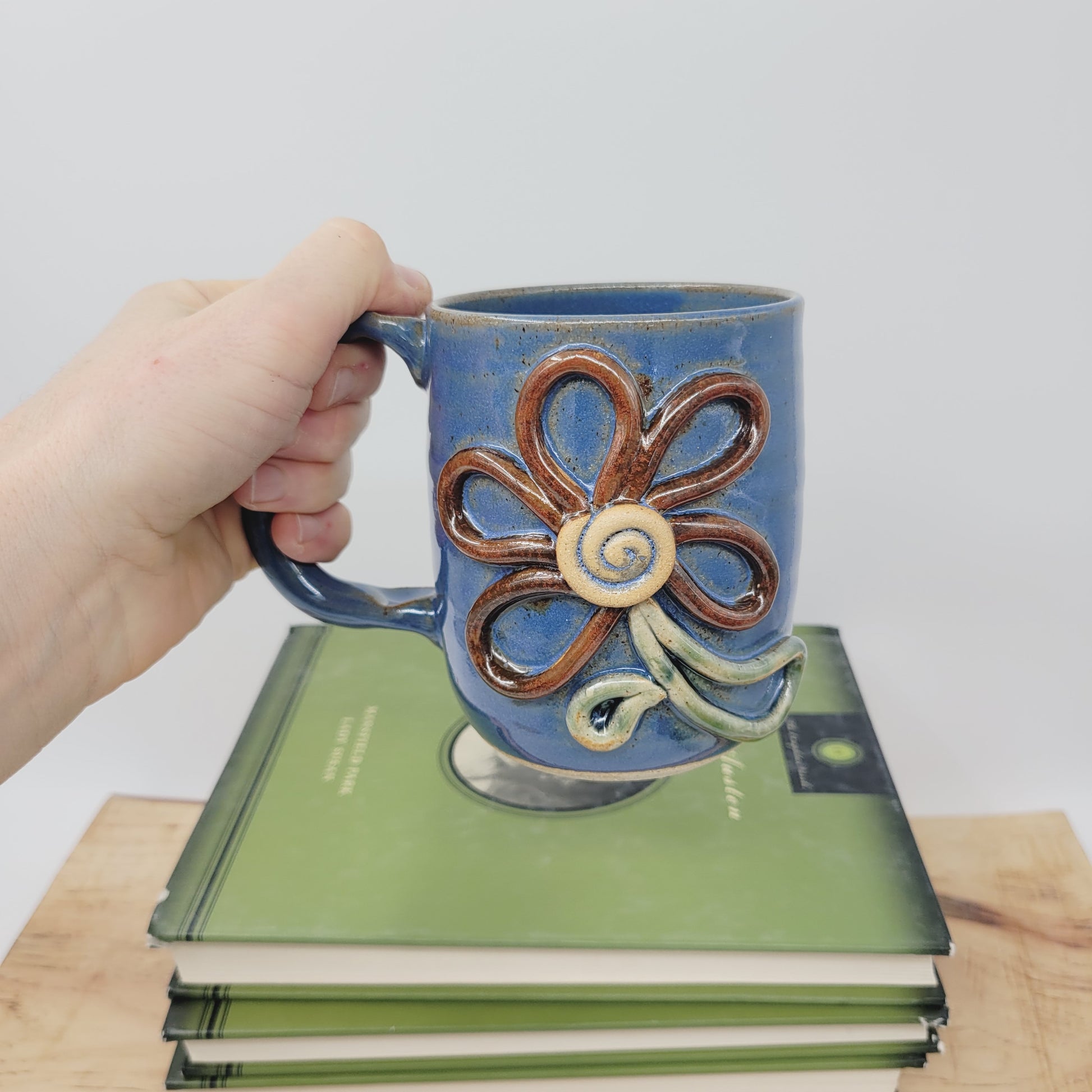 This coffee cup is a one of a kind piece of pottery. It was first thrown on the pottery wheel, and then the flower detail was made and added by hand. It is completely made from cone 10 stoneware, which makes it very durable and even safe to use in the microwave and dishwasher.