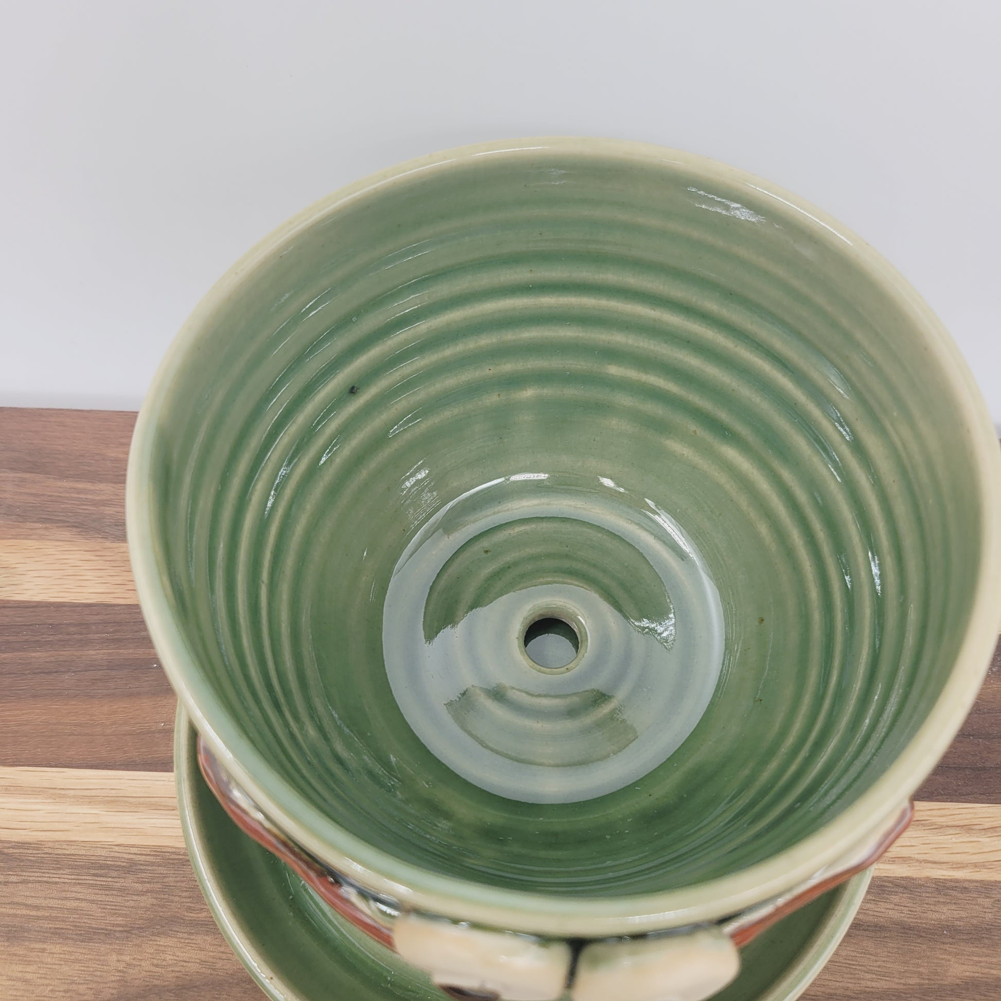 Ray is about 3.5" tall and 5" wide and comes with a drainage plate. He's finished with a food-safe glaze in Green. He is an Ug-Chug Planter, so he's signed and dated.