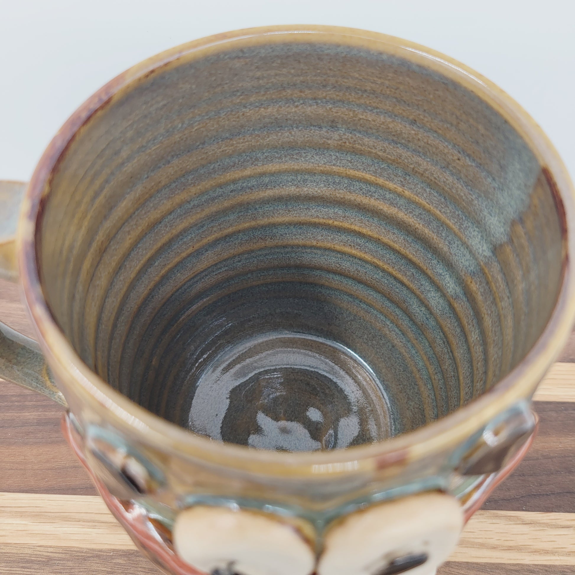 Mike is a one of a kind piece, completely handmade from cone 10 stoneware. He was first thrown on the pottery wheel, and then his features were added by hand. He is very durable and is even safe to use in the microwave and dishwasher. He is an Ug-Chug Mug, so he's stamped with the Ug-Chug logo and his year.
