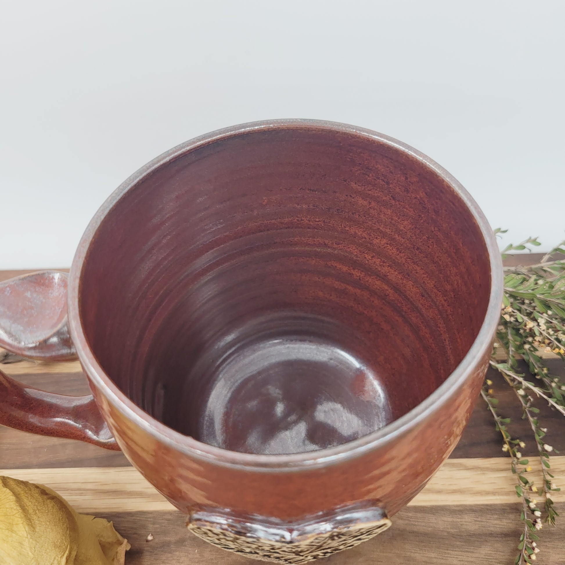 This mug is about 4" tall and 3.5" wide and holds about 16 ounces. It is finished in a food-safe rustic red glaze, with the heart in black and bare clay. It is stamped with the Ug-Chug logo and its year.