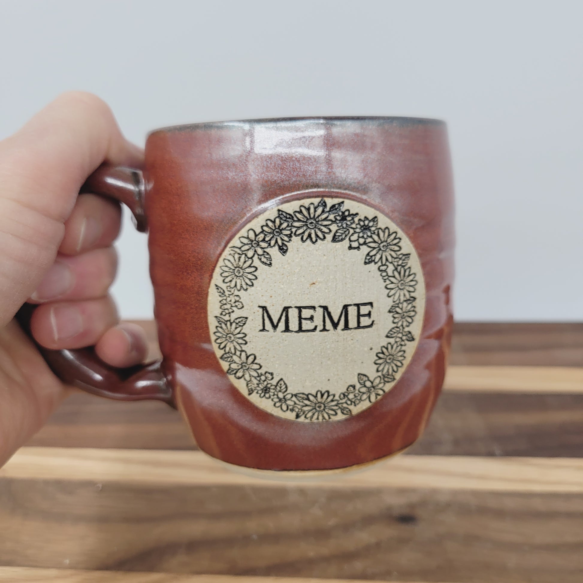 This mug was made on the pottery wheel, and then the Meme stamp detail was stamped and added by hand. It is made from cone 10 stoneware, which makes it very durable.