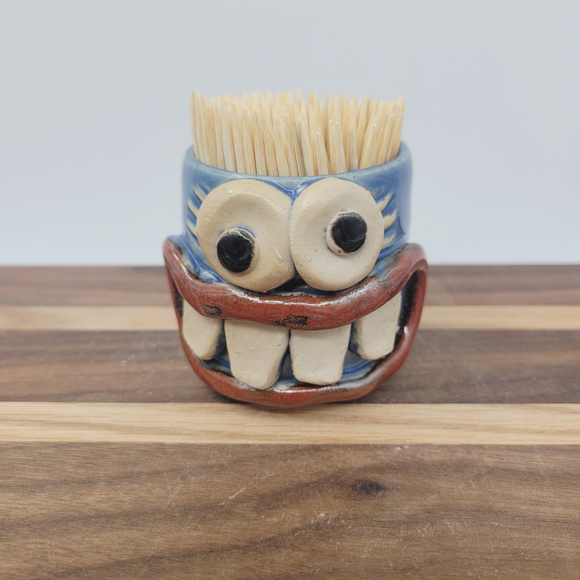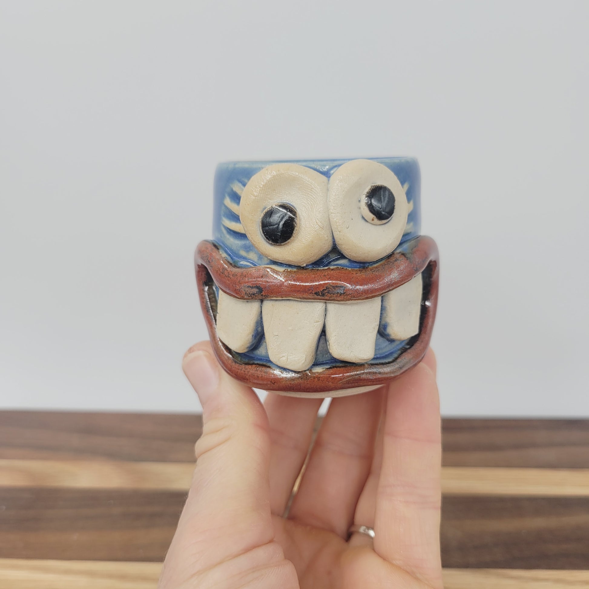 Meet your new pint-sized companion with a permanent smile! This charming handmade stoneware mini cup is as versatile as it is delightful. Wrangle toothpicks, organize office supplies, showcase miniature treasures, or serve up a quick drink—this cheerful little character does it all.