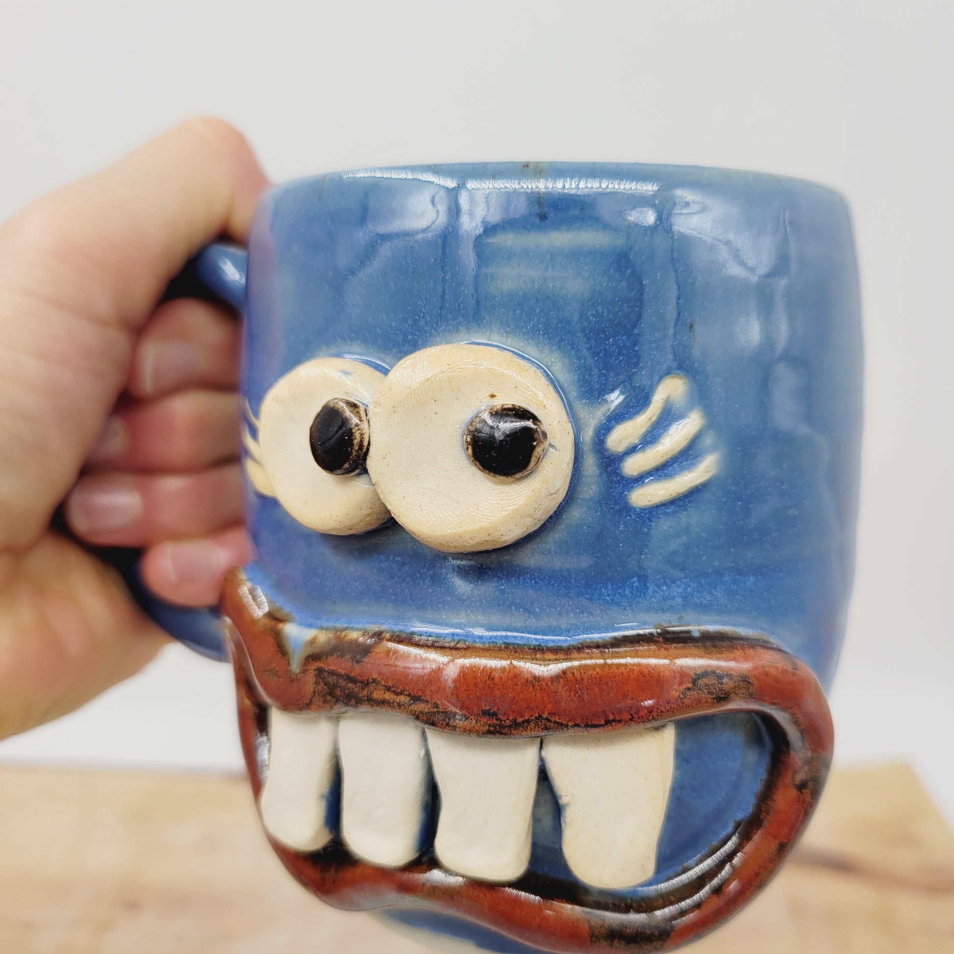Despite being perpetually behind, Becky is an excellent beverage holder. She's great for coffee, tea, cocoa, and cold beverages, too, and is made from cone 10 stoneware, so she's very durable. Becky is a one of a kind piece, completely handmade from cone 10 stoneware. She was first thrown on the pottery wheel, and then her eyes, mouth, and teeth were added by hand. She is very durable and is even safe to use in the MICROWAVE and DISHWASHER.