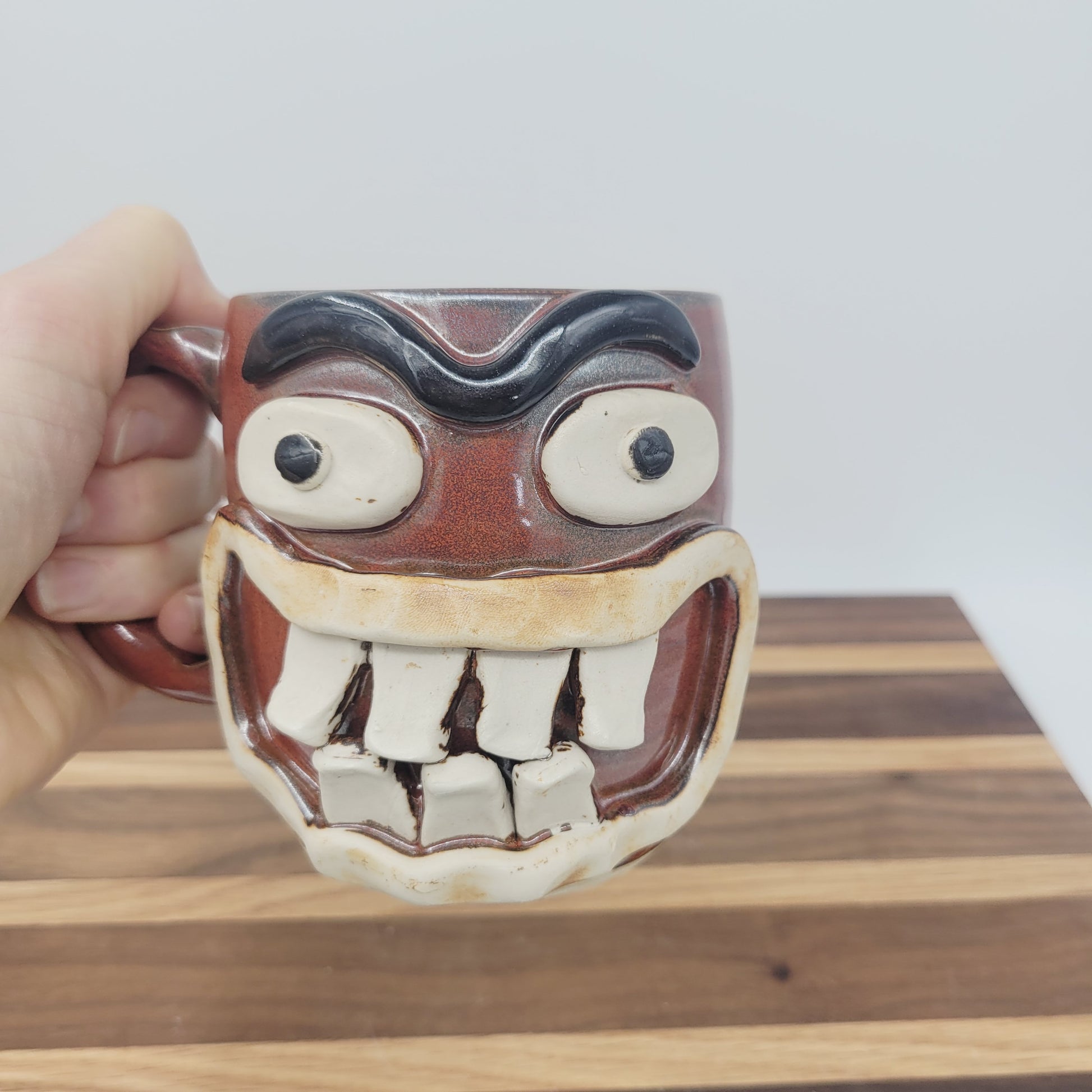 Henry's certainly not concerned with his toilette, but he loves holding beverages, and he's great at it! He was first thrown on the pottery wheel and his eyes and features were made and added by hand. He's made from cone 10 stoneware, so he's very durable and is even safe to use in the microwave and dishwasher. Henry is an Ug-Chug Mug, so he's stamped with the Ug-Chug logo and his year.