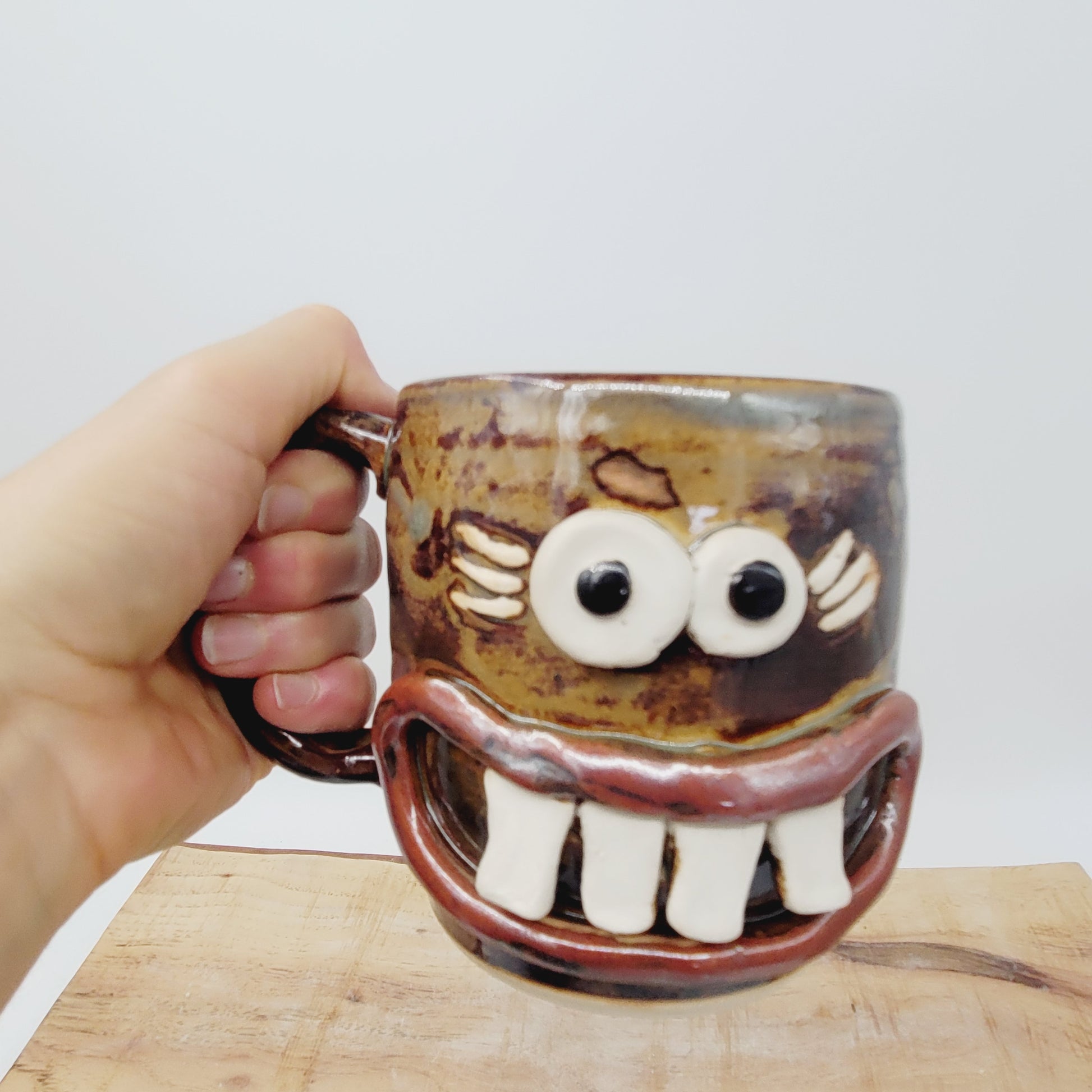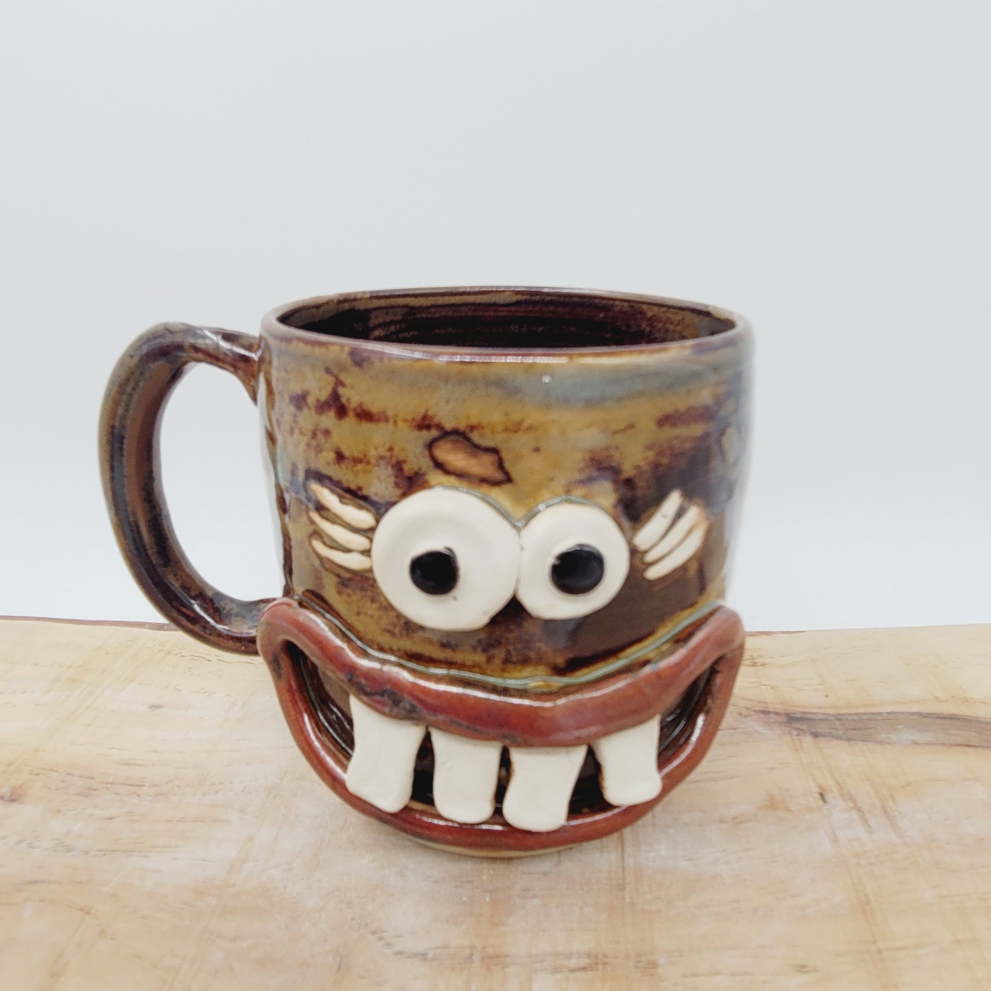 Jane was first thrown on the pottery wheel and her eyes and features were made and added by hand. She's made from cone 10 stoneware, so she's very durable and is even safe to use in the microwave and dishwasher. She is an Ug-Chug Mug, so she's stamped with the Ug-Chug logo and her year.