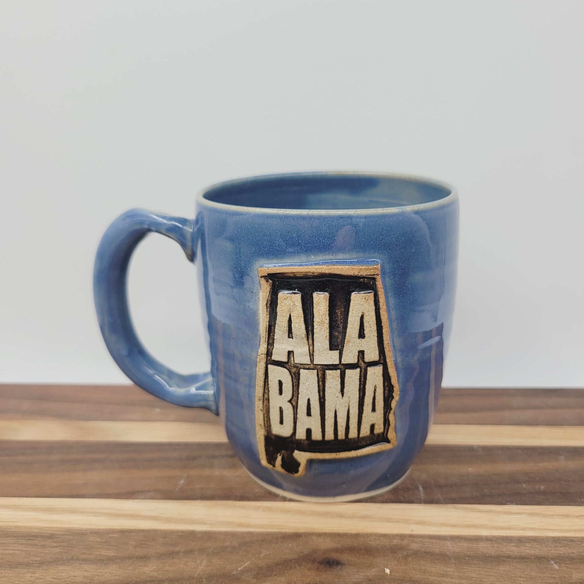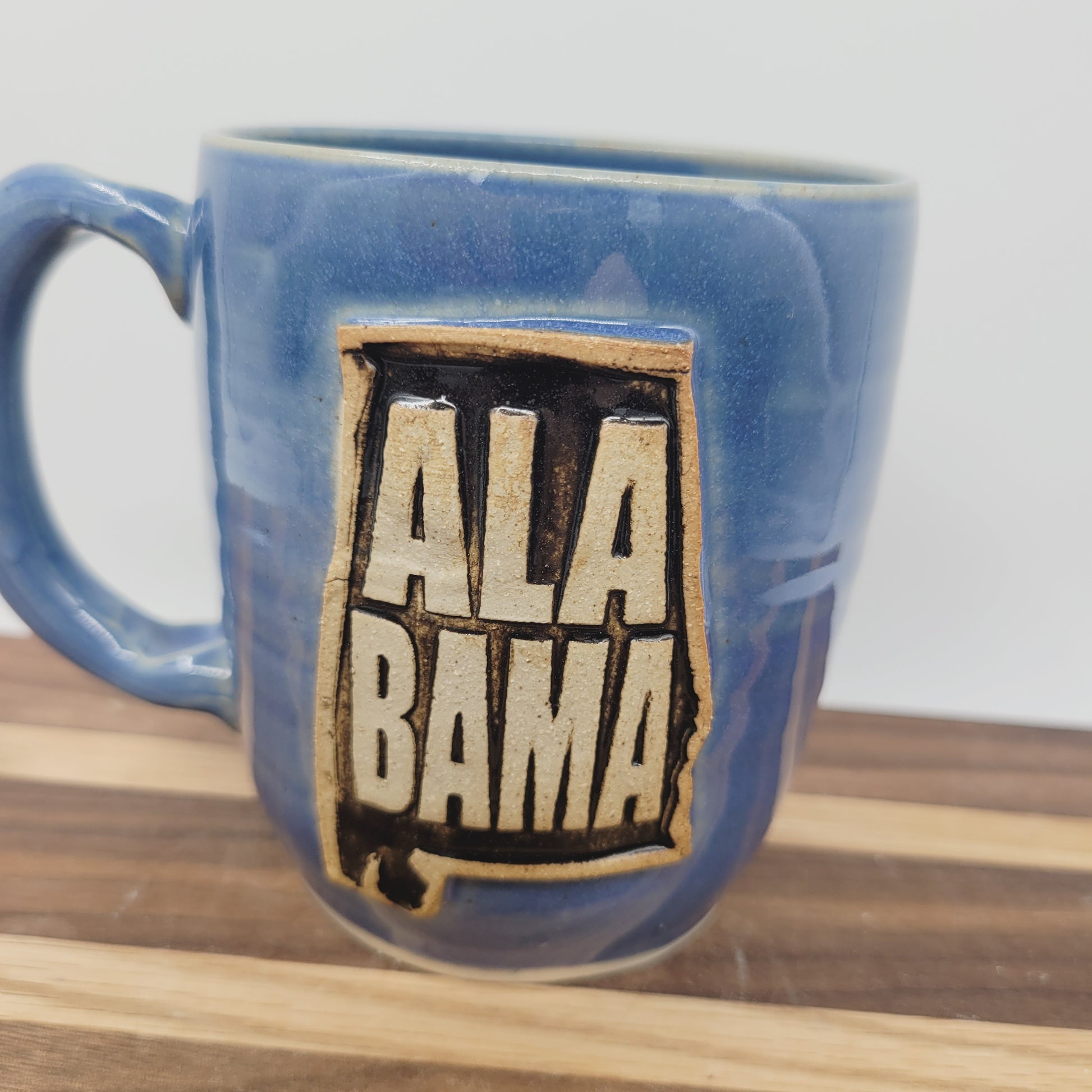 This coffee cup is a one of a kind piece of pottery. It was first thrown on the pottery wheel, and it features a raised stamp in the shape of the state of Alabama.