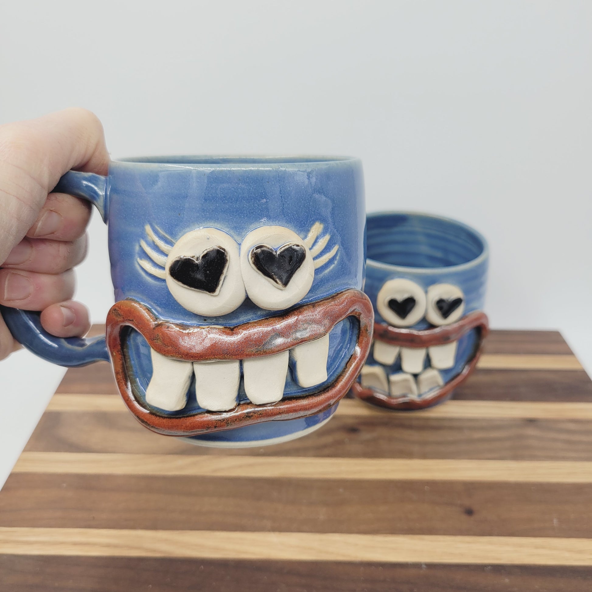 Spread love and laughter with this handmade set of stoneware mugs. They feature heart-shaped eyes and big grins, making them a perfect blend of affection and fun!