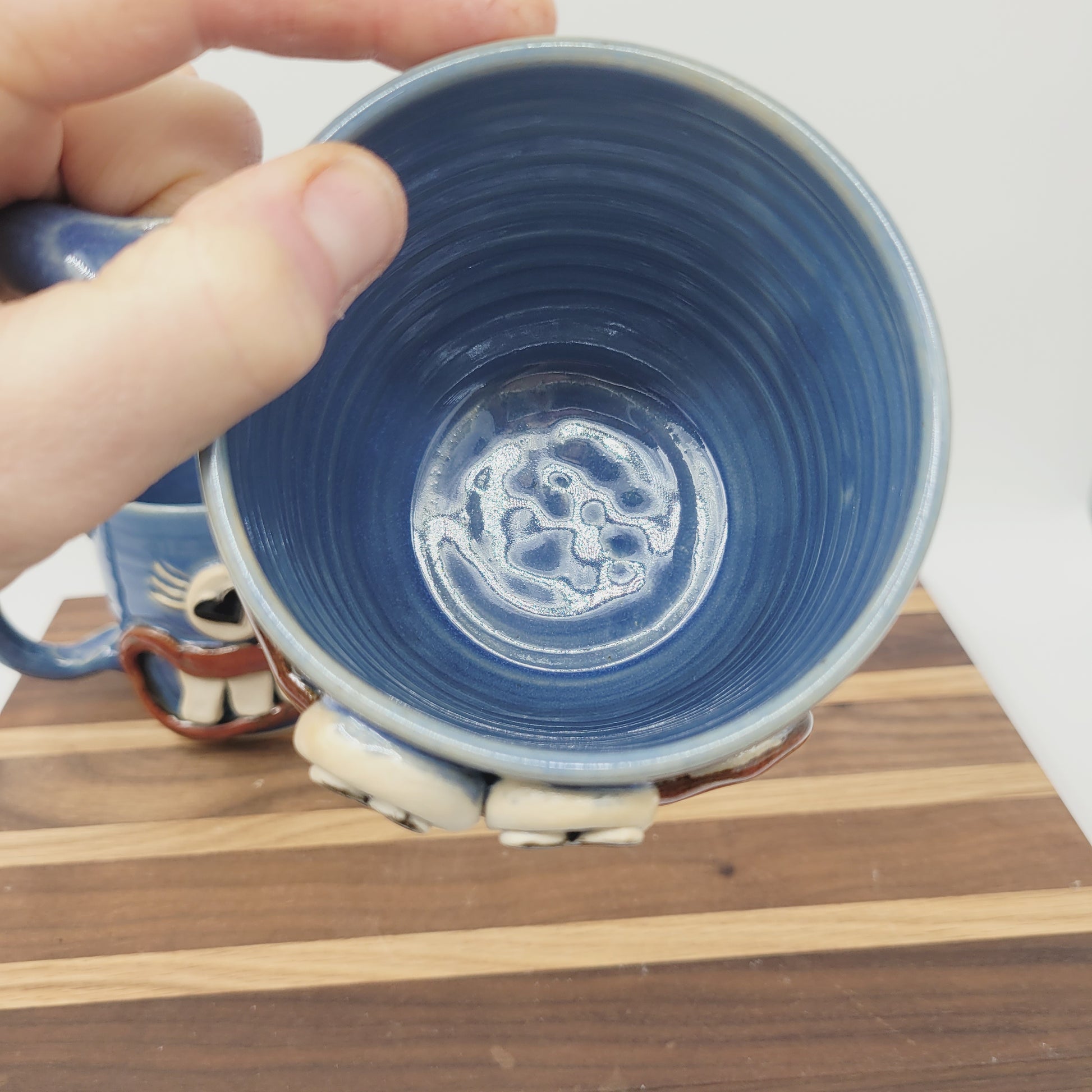 Ted and Tiffany are both finished with a food-safe glaze in blue. They are Ug-Chug Mugs, so they are stamped dated.