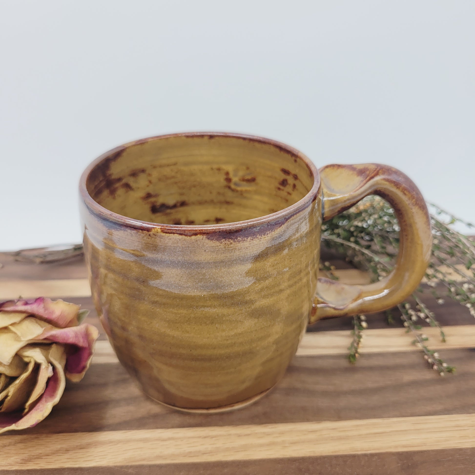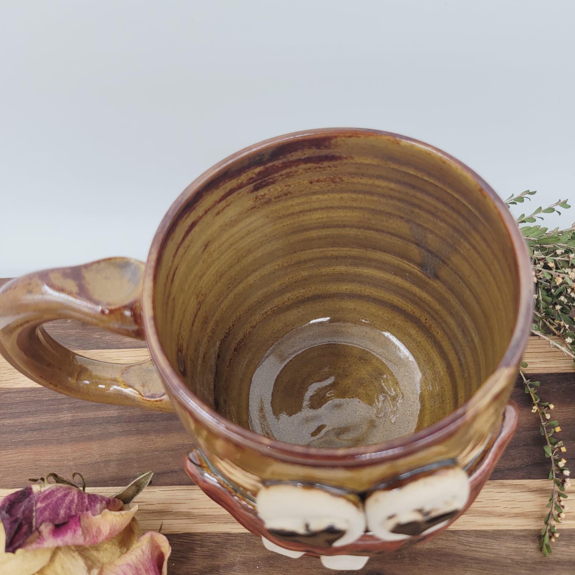 Emma is about 3.75" tall and 3.25" wide, and she holds about 14 ounces. She is finished with a food-safe glaze in caramel. She is an Ug-Chug Mug, so she's stamped with the Ug-Chug logo and her year.
