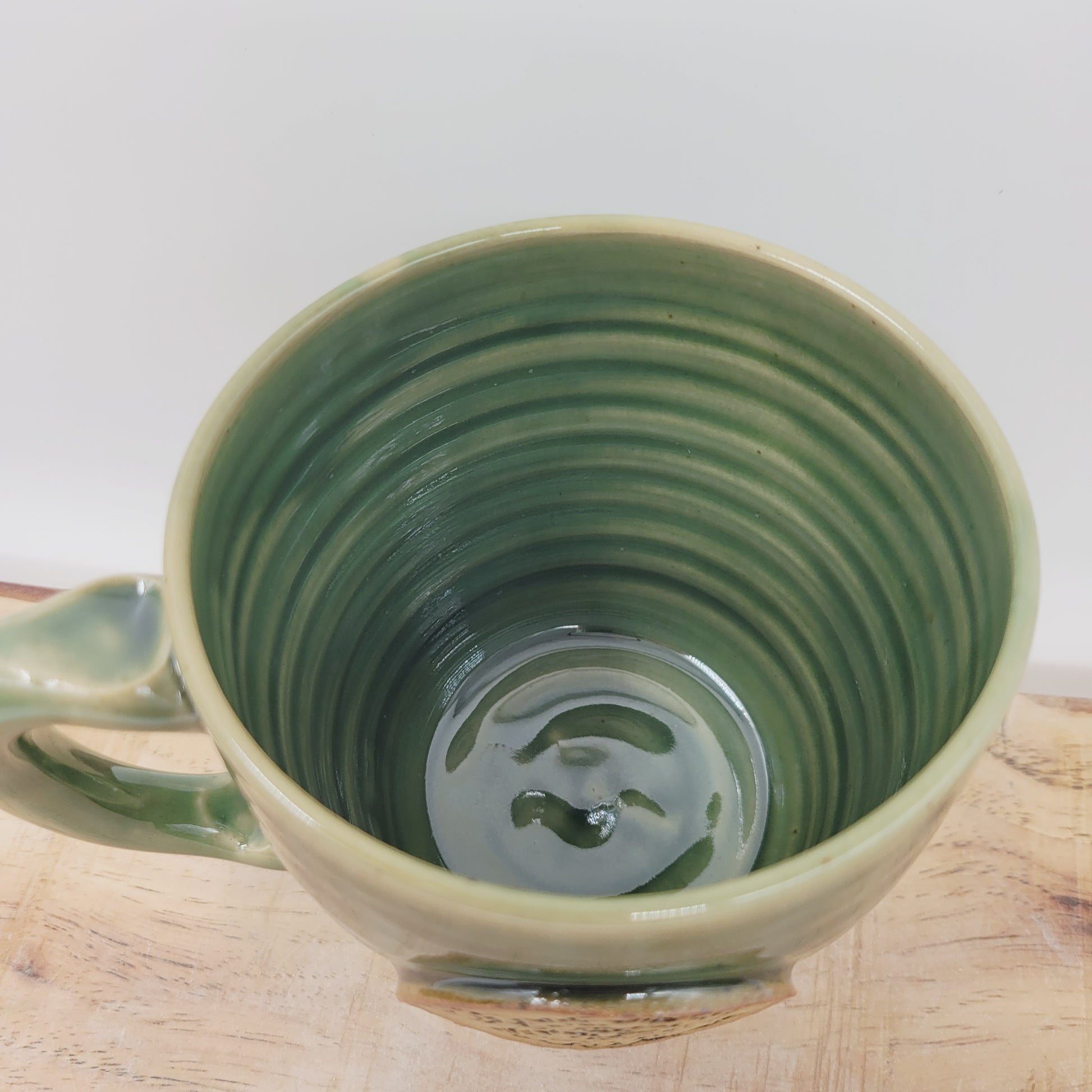 This mug was first thrown on the pottery wheel, and the stamp was added by hand. It is finished in a food-safe green glaze and is microwave and dishwasher safe.