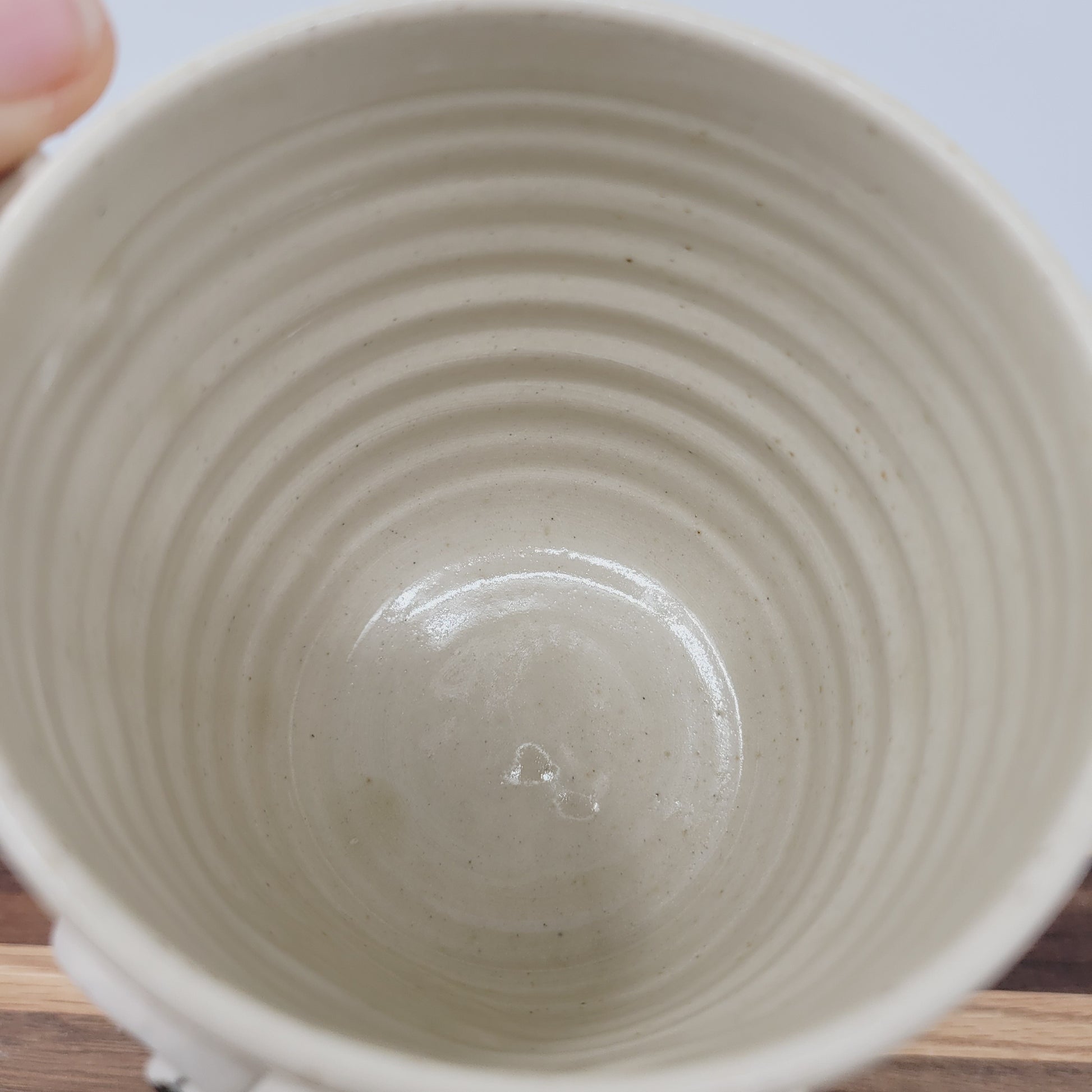 Fluffy also enjoys serving beverages, and she is great at it! She is a one of a kind piece of pottery, completely handmade from cone 10 stoneware. She was first thrown on the pottery wheel, and then her eyes and features were added by hand. She is very durable and is safe to use in the MICROWAVE and DISHWASHER.